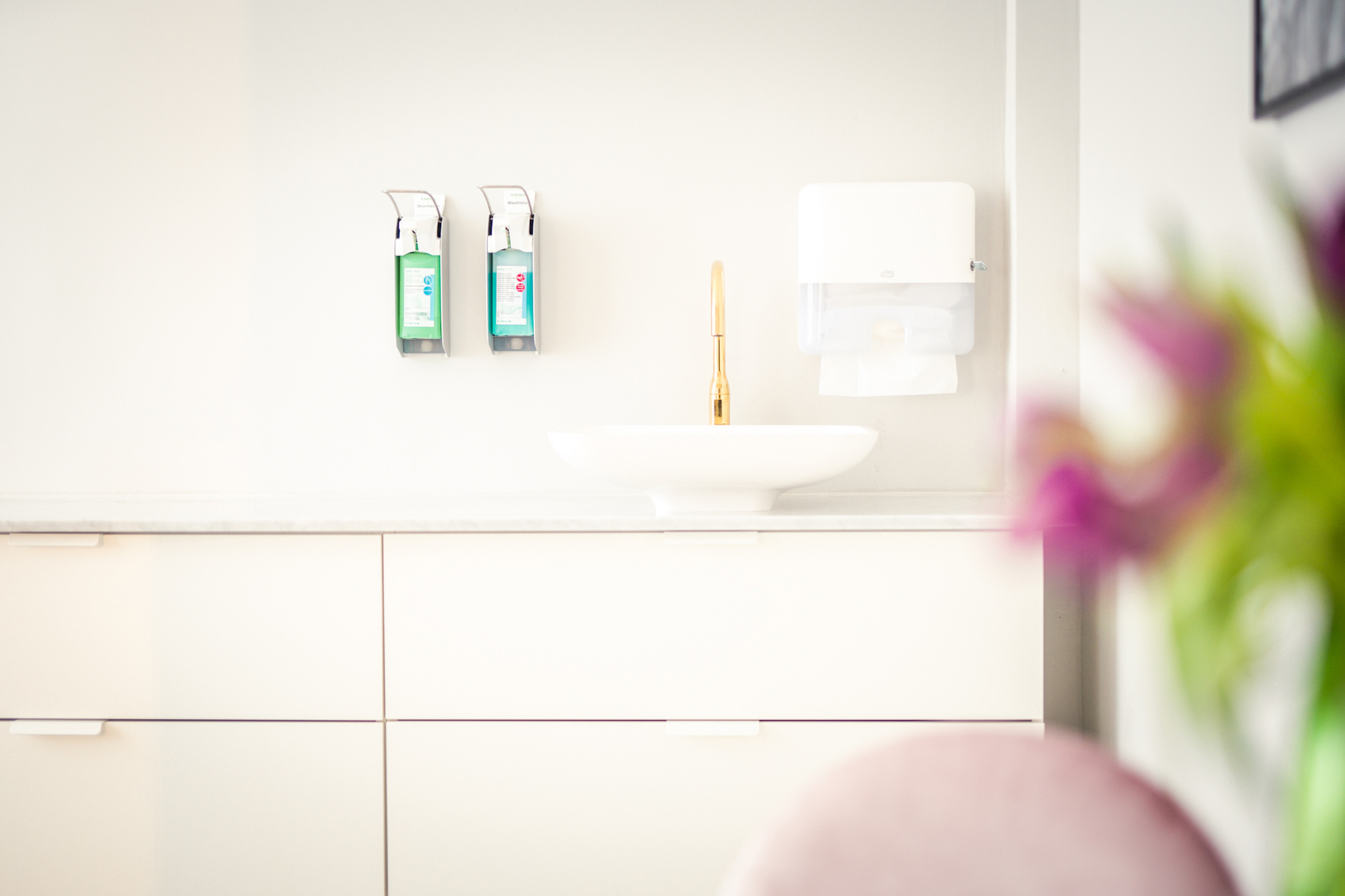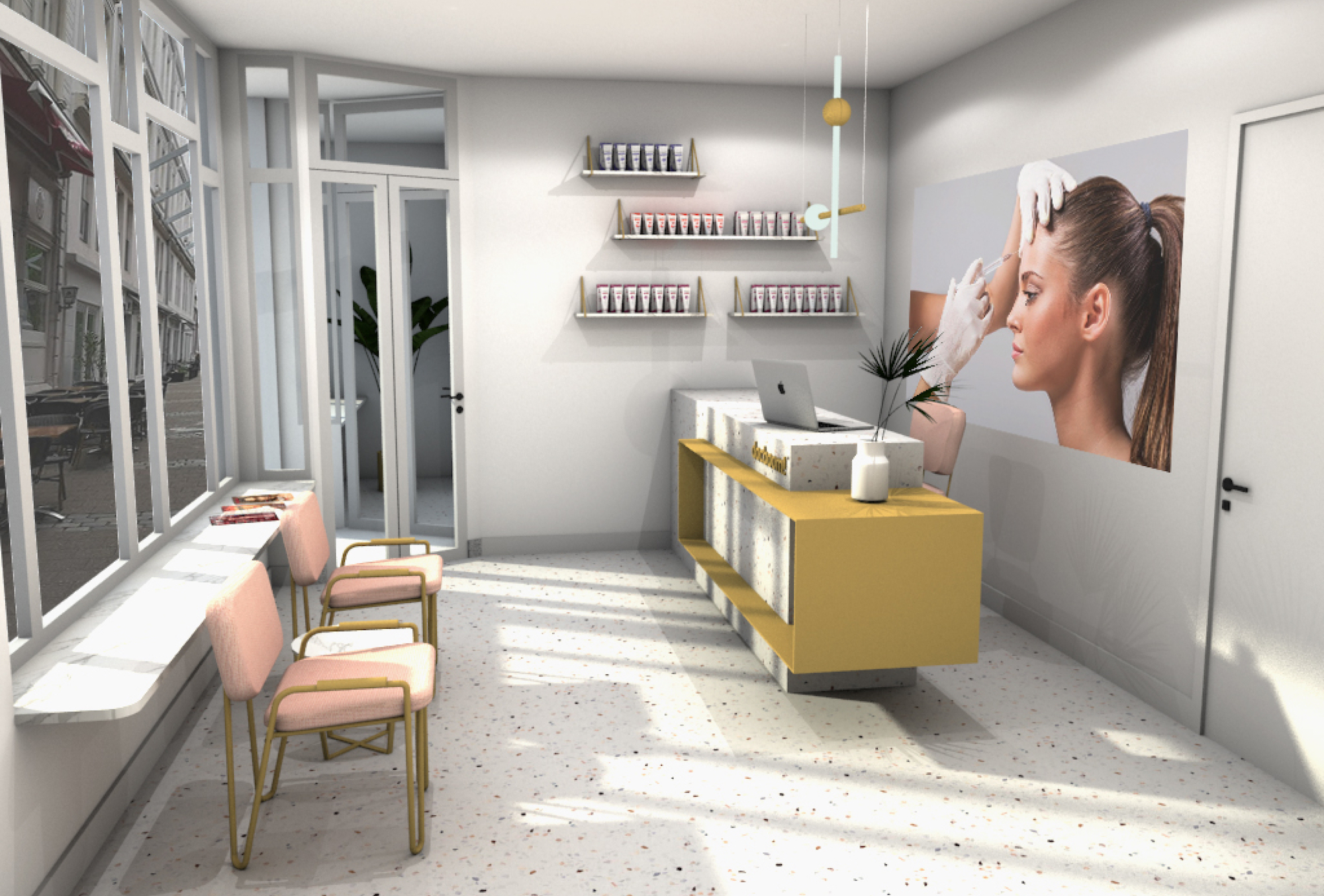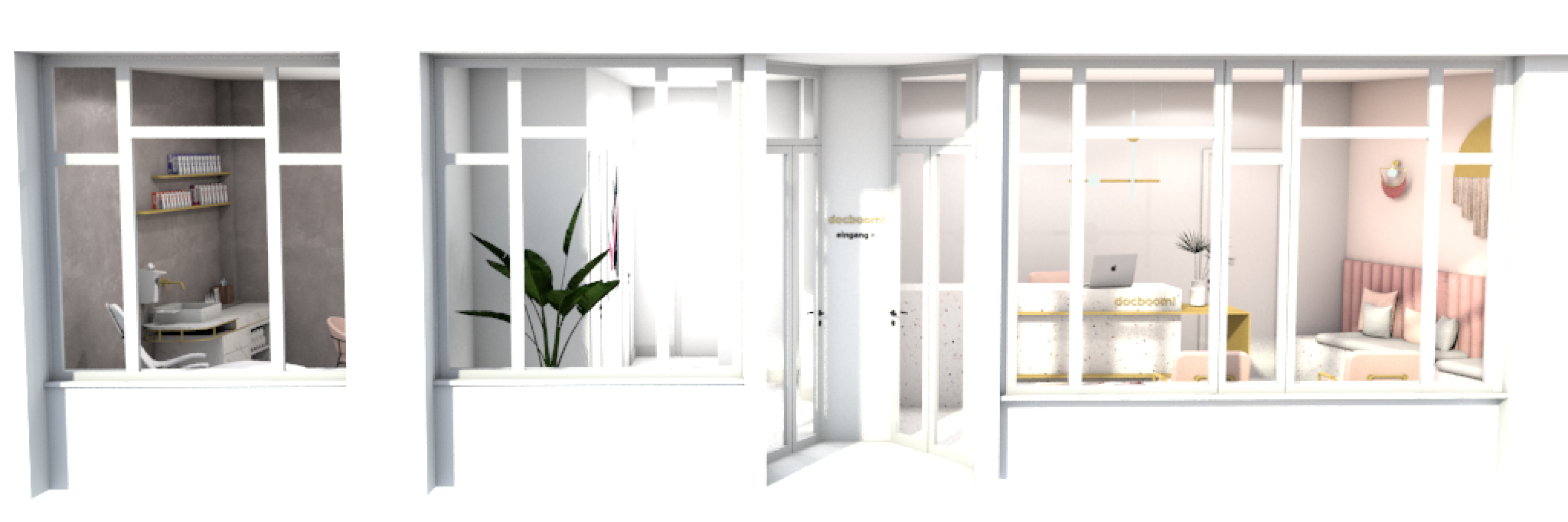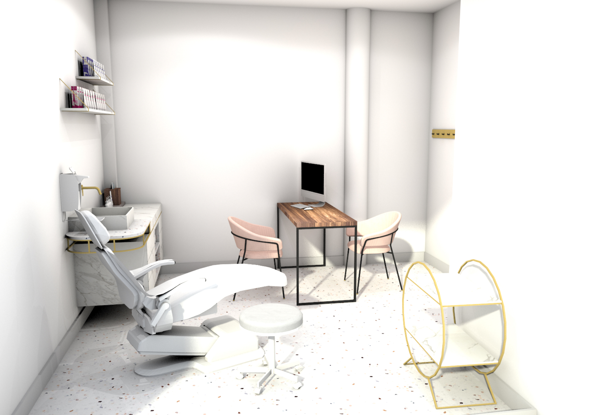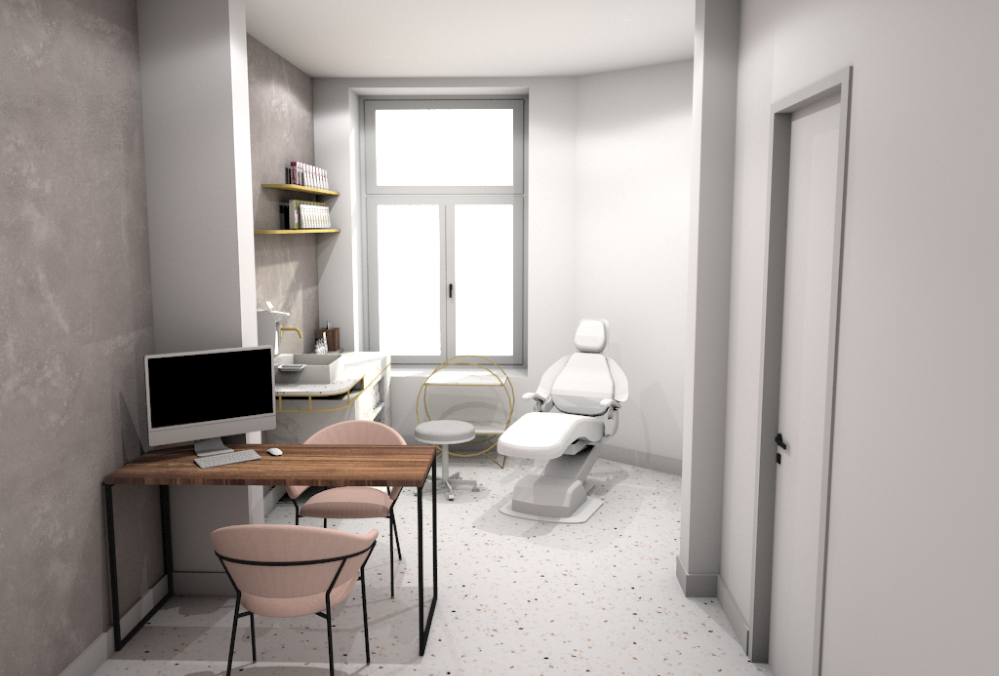 I created two waiting rooms so that both treatment rooms will have their own waiting areas. This way, people can see the same design from the outside through the two front windows and understand that it is the same business. Some signage can be placed on the wall between the two doors to explain where the reception desk and the different treatment rooms are. I also designed some bespoke furniture (counter, preparation tables for the doctors, mirrors, coat rack, shelving) with the same materials and colors.