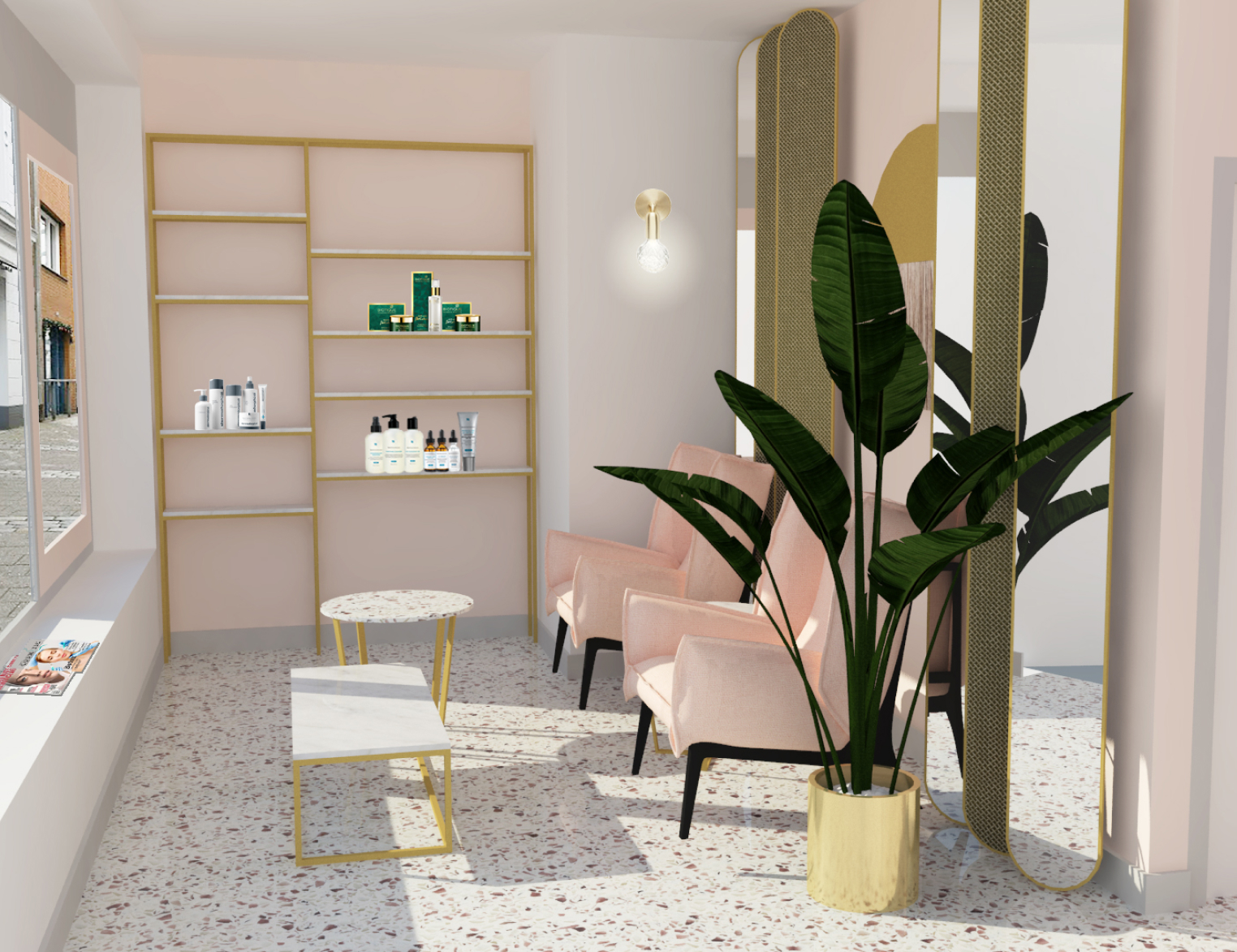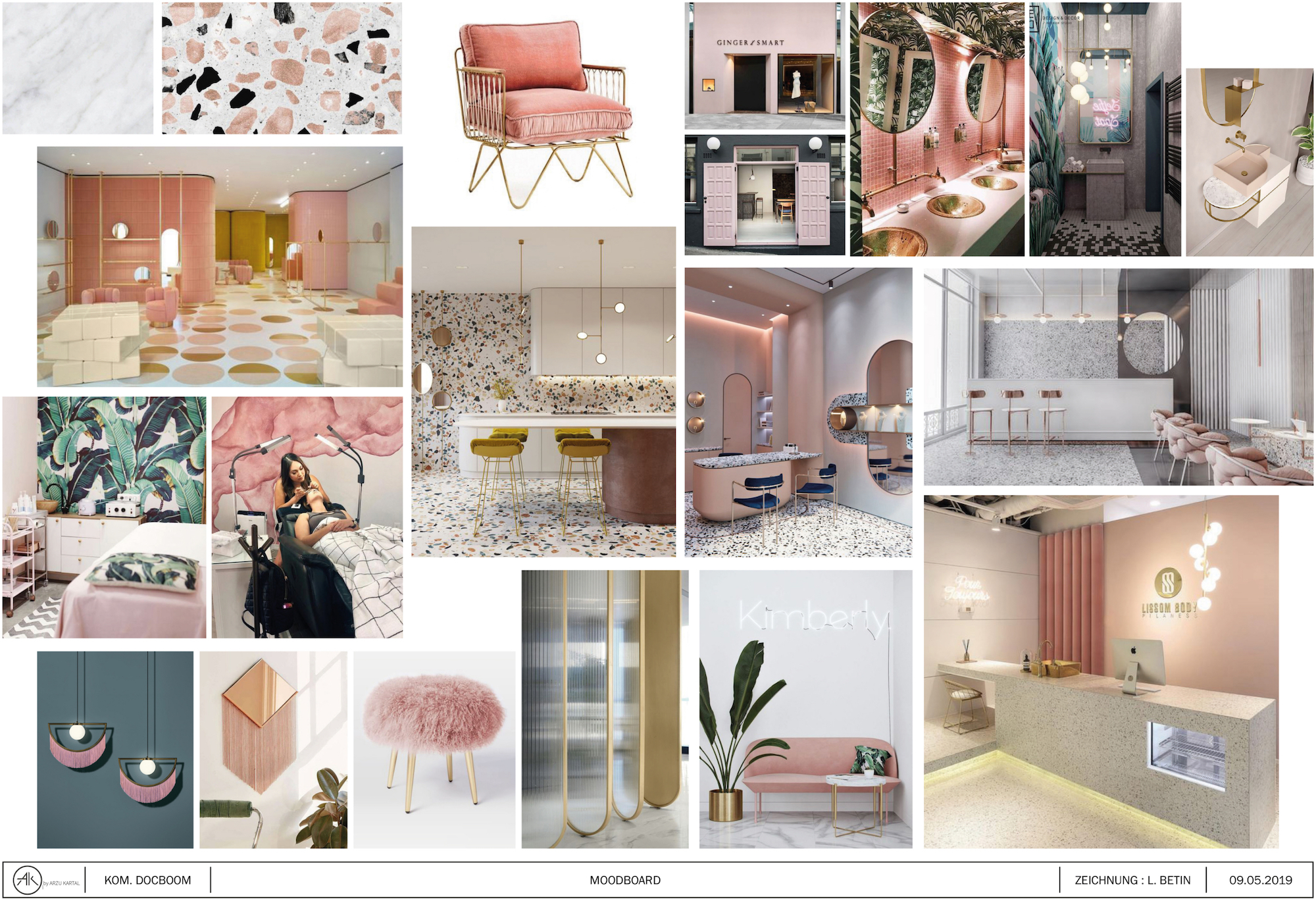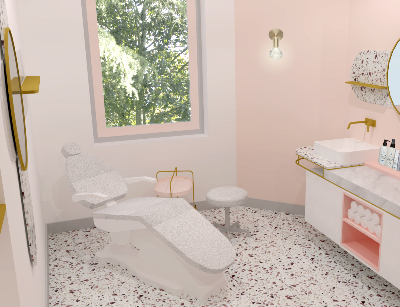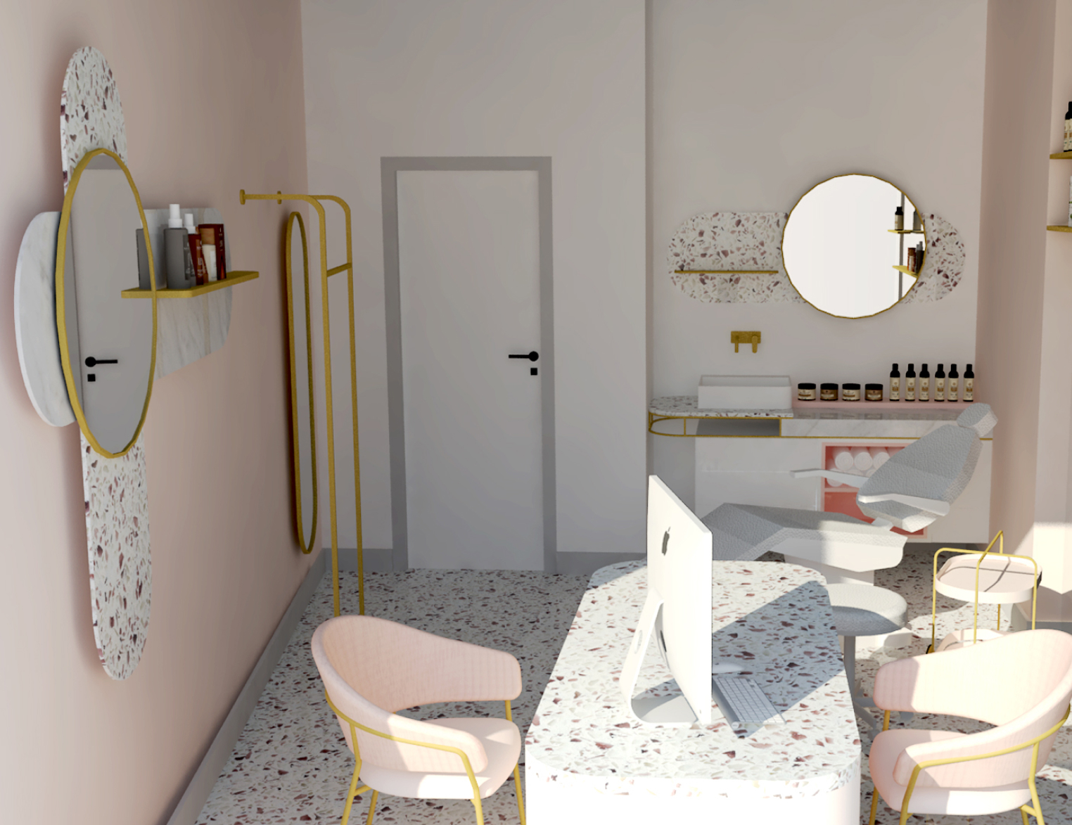 After applying with the local authorities to turn the existing space into a clinic, and studying the regulations related to spaces dedicated to health (fire standards, floor types, prohibited), I started doing research to find inspiration and set up a moodboard. A moodboard is a board made up of photos that inspired me and I used it to share my ideas with the clients. For this luxurious atmosphere, I favored materials like brass, marble and terrazzo. The clients agreed on a pink color chart to bring more dynamism, and to catch people’s eyes from the street.