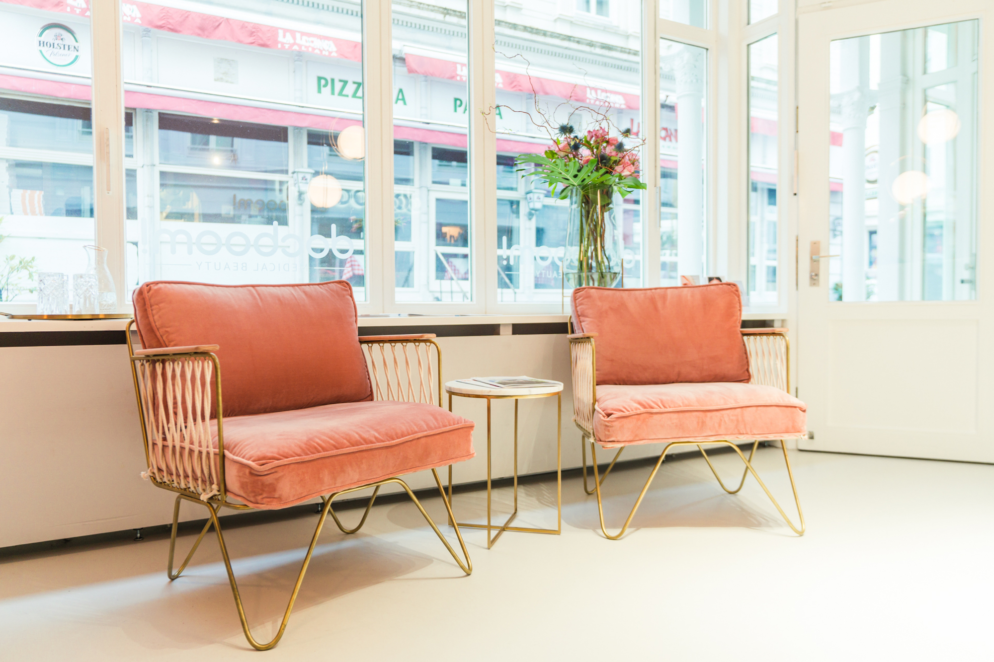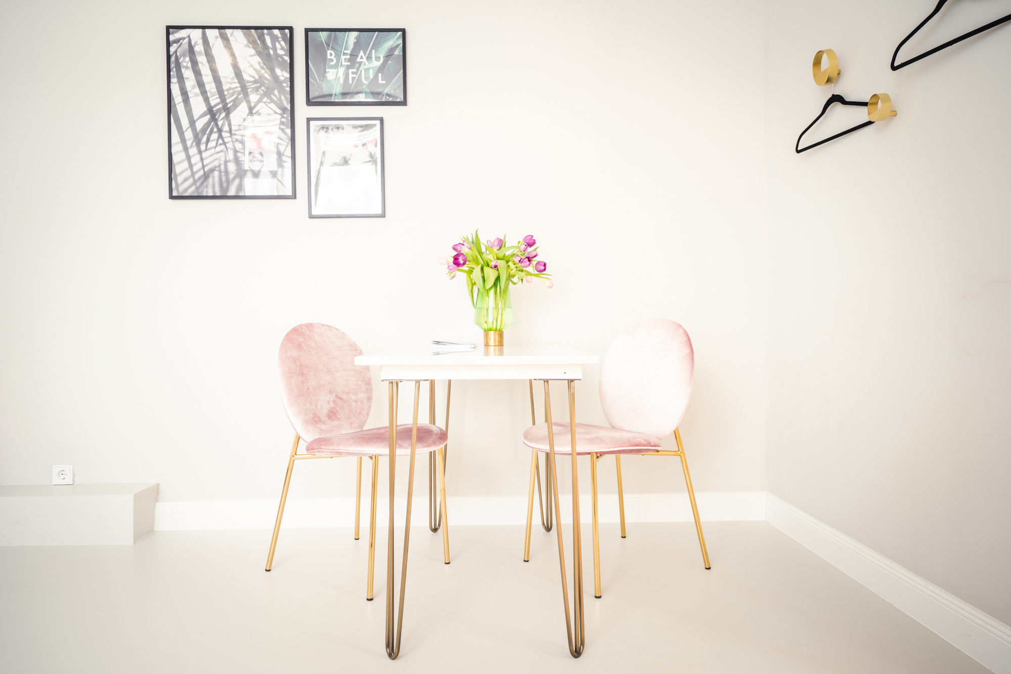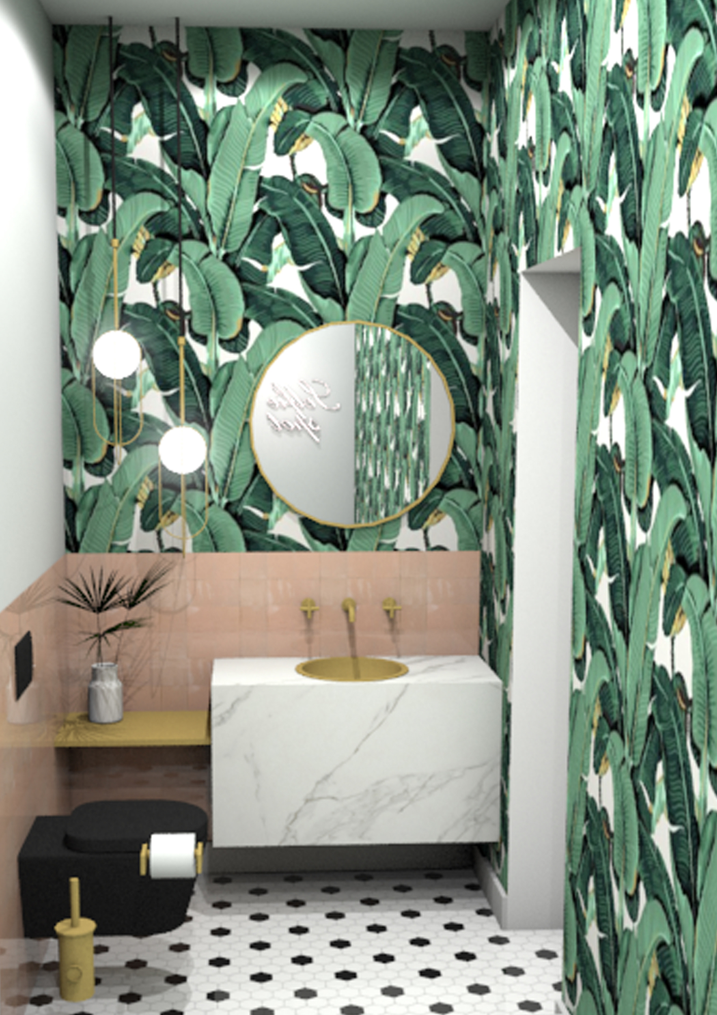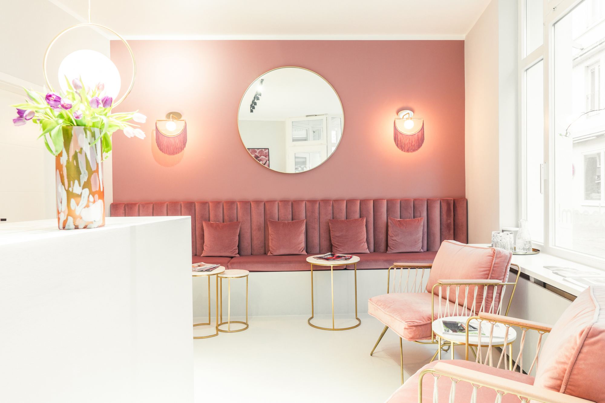 After applying with the local authorities to turn the existing space into a clinic, and studying the regulations related to spaces dedicated to health (fire standards, floor types, prohibited), I started doing research to find inspiration and set up a moodboard. A moodboard is a board made up of photos that inspired me and I used it to share my ideas with the clients. For this luxurious atmosphere, I favored materials like brass, marble and terrazzo. The clients agreed on a pink color chart to bring more dynamism, and to catch people’s eyes from the street.