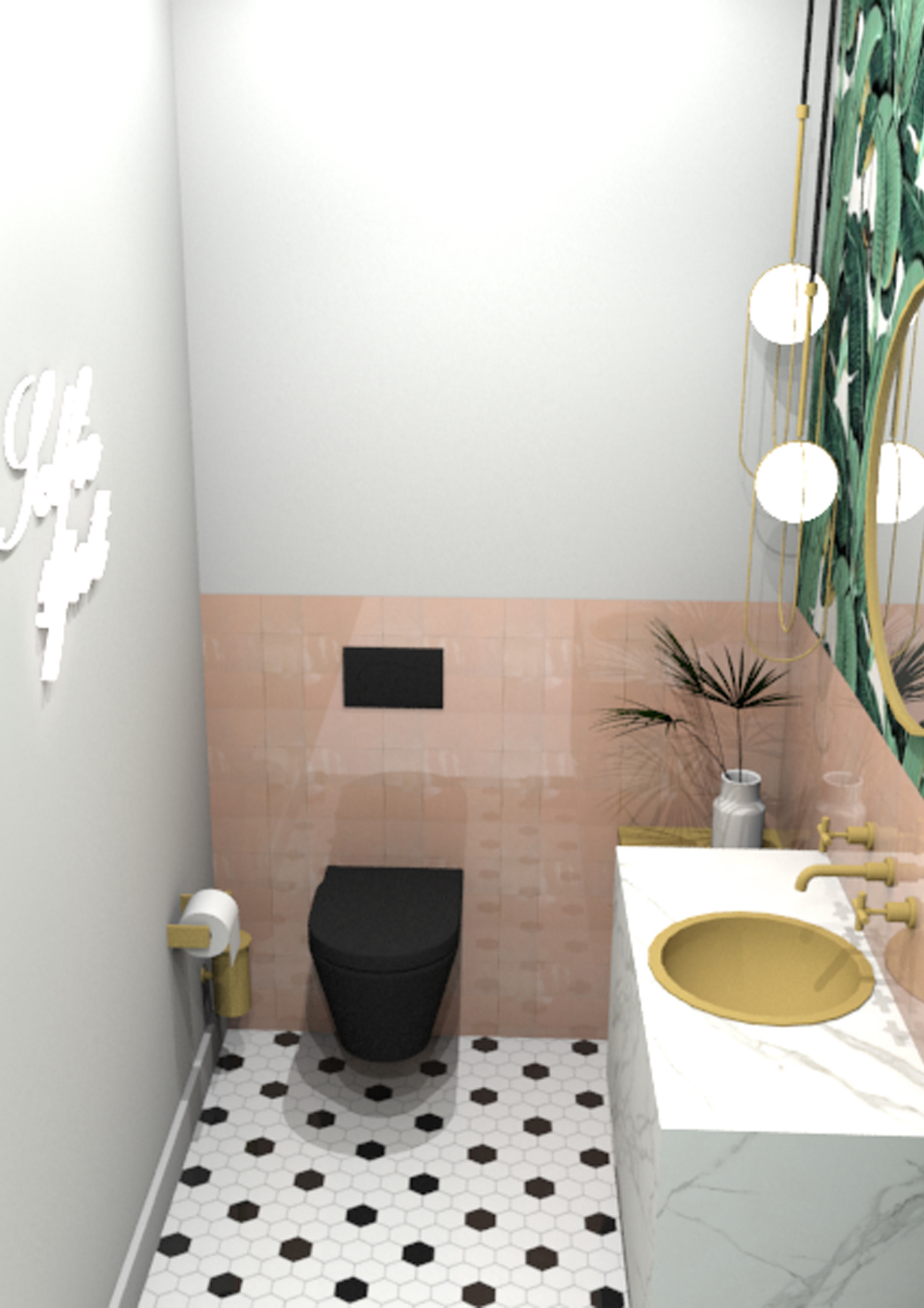 Despite the fact that the clients loved the design and that I tried to reduce the usage of brass and marble to the minimum, it was still too expensive for them. They also added a new request to have three treatment rooms instead of two. Finally, according to the two future doctors, it was too pink for them.
