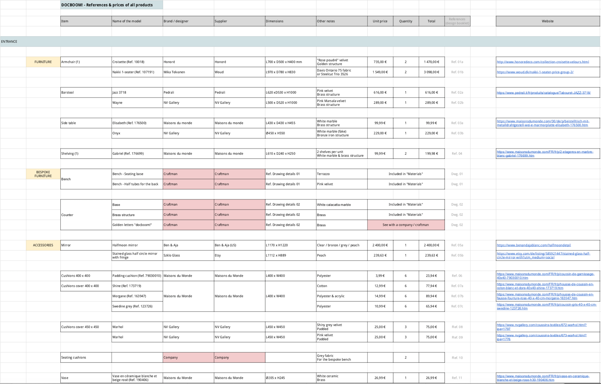 I used a management tool called “bill of quantities”, which I had learned during my previous internship at DAAA Haus in Malta. It is essentially a sheet where all the elements are listed, making it easier to know if something is missing, to take stock of the costs, and to keep track of the online order and delivery. This bill of quantities is linked to a design booklet with inventory pictures, names and brands of all these elements. If it is bespoke furniture, the name of the associated drawing is written next to it.
