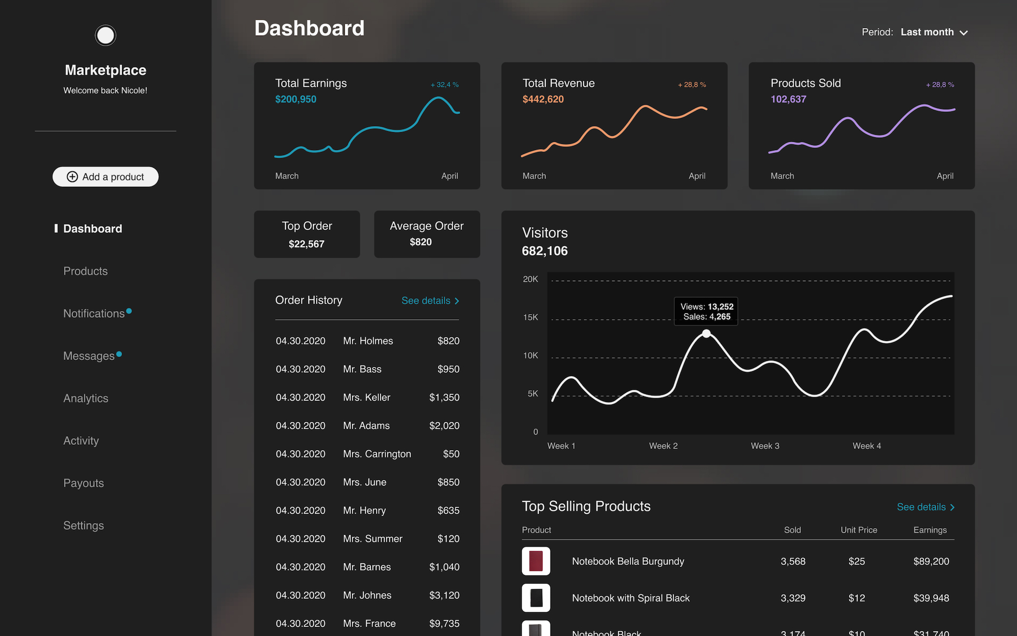A dashboard is an essential point for business owners as it gives an overview of all the earnings and orders. They can also see how many people visited their marketplace, how many products were sold, and what the best sellers were. It can help them improve their future sales by identifying how their consumers interact with the products.